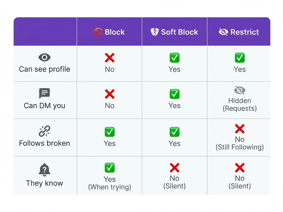 Regular blocking prevents someone from seeing your profile at all. Soft blocking (block then immediately unblock) just removes the follow connection while leaving profile access intact. They can still see your public content, but won’t see it in their feed automatically.